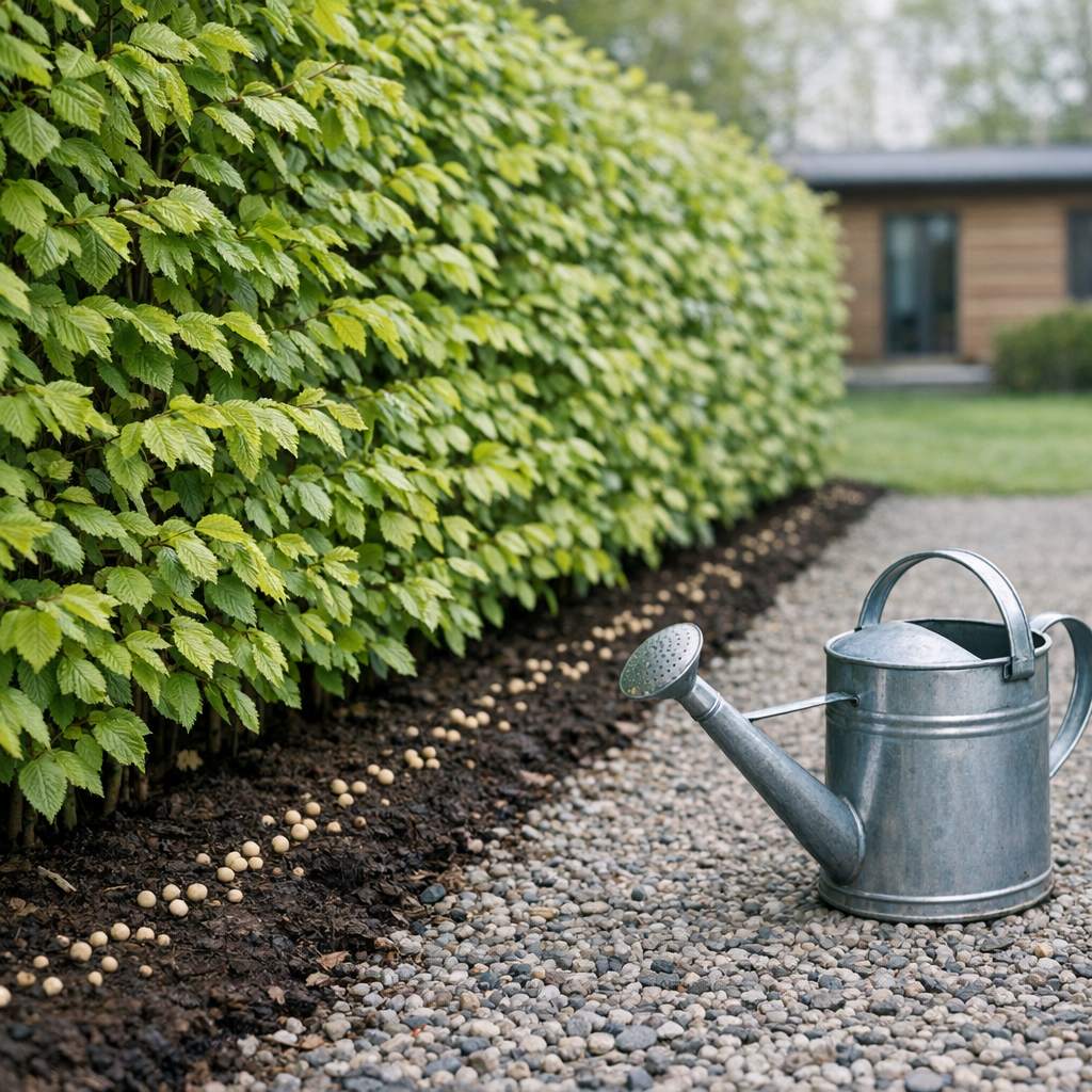 17 februari 2026 4 min 1817 Innehållsförteckning När ska du gödsla häcken?Vilken gödsel passar din häck?Så gödslar du – steg för stegVanliga misstag att undvikaSnabbguide per häcktypFAQ om att gödsla häckVad gödslar man en häck med?När ska man gödsla sin häck?Hur mycket hönsgödsel till häck?Kan man gödsla häck för mycket? När ska du gödsla häcken? Prioritera vårgiva när jorden reder sig – oftast april-maj. Då sätter du grunden för säsongens tillväxt. En kompletterande, lätt sommarvård i juni-juli kan hålla farten uppe. Undvik att gödsla sent på hösten med kväverik gödsel – mjuk nytillväxt hinner inte avmogna. Behöver du förbättra jordstrukturen kan du i stället mylla in kompost i september-oktober. Nyplanterad häck gödslar du försiktigt första säsongen och fokuserar på jordförbättring och jämn bevattning. Etablerade häckar klarar sig oftast med 1-2 givor per säsong beroende på art och jord. För praktiska rutiner under växtsäsongen, se sommarskötsel av häck. Vilken gödsel passar din häck? Det finns ingen enskild “bästa gödsel för häck” – välj efter behov och jord. Organisk gödsel: Kogödsel/kompost ger långsam, jämn näring och bygger jordstruktur. Bra bas för de flesta häckväxter. Hönsgödsel: Kväverik och effektiv. Används i små, uppmätta givor och krattas ner. Passar när du vill pigga upp tillväxt. Mineral NPK: Exempelvis blåkorn – ger snabb effekt. Följ dos noggrant och vattna väl för att undvika rot- och bladbränna. Flytande gödsel: Snabbverkande lösning under säsong, särskilt vid krukodling eller när du behöver korrigera brist. De flesta häckar trivs i svagt sur till neutral jord. Odlar du surjordsväxter låter du bli kalk och väljer gödsel anpassad för lågt pH. Anpassa alltid mängd efter produktens anvisning, jordens bördighet och häcktyp. Behöver du hjälp att välja rätt produkt? Läs välja gödsel till häck. Så gödslar du – steg för steg Rensa ogräs och vattna igenom vid torka så att jorden är lätt fuktig. Mät upp dos. Som riktlinje: 0,5-1 liter kogödsel per meter häck eller 50-80 g NPK per meter. Pelleterad hönsgödsel 30-60 g per meter. Fördela i droppzonen – där yttersta grenarna slutar – inte tätt mot stammen. Kratta ner lätt i ytan och undvik kontakt med blad och stammar. Vattna igenom för att aktivera näringen och minska brännrisken. Följ upp med en lätt sommarpåfyllning vid behov. Vill du samtidigt förbättra jordens struktur och näringsupptag? Se perfekt planteringsjord. Vanliga misstag att undvika Överdosera kväve – ger mjuk tillväxt och sämre vinterhärdighet. Sen höstgödsling med kväve – ökar risken för frostskador. Gödsla i torr jord – vattna före och efter. Lägga gödsel mot stam och blad – kan orsaka brännskador. Glömma jordhälsan – tillför årligen kompost eller mull. Vill du koppla näring och jordkvalitet för snabb tillväxt? Läs gödsla och jord till snabbväxande häck. Snabbguide per häcktyp Häcktyp Tid Gödsel Tips Avenbok Vår, ev. lätt sommar Kompost/kogödsel, ev. låg dos NPK Gödsla avenbok häck tidigt – undvik sen höst. Bokhäck Vår Organisk bas, försiktig NPK Gödsla bokhäck vår för jämn tillväxt. Liguster Vår + lätt sommar Kogödsel eller hönsgödsel i små givor Gödsla häck liguster med måtta. Thuja Vår Organisk bas, balanserad barrgödsel Vattna extra – thuja är känslig för torka. Aronia Vår Kompost/kogödsel Behöver sällan höga kvävegivor. Nyplanterad häck Efter rotning, sparsam Svag organisk giva Fokusera på jord och bevattning första säsongen. För helhetsvård genom säsongen kan du följa våra skötselråd för häckar. FAQ om att gödsla häck Vad gödslar man en häck med? En organisk bas som kogödsel eller kompost fungerar för de flesta. Behöver du snabb effekt kan du komplettera med en balanserad NPK eller flytande gödsel – följ dosanvisningar. När ska man gödsla sin häck? Gödsla på våren när jorden blivit varm. Fyll på lätt i början av sommaren vid behov. Undvik kväverik gödsling efter augusti för att minska frostskador. Hur mycket hönsgödsel till häck? Håll dig till små, uppmätta givor – cirka 30-60 g per meter häck, nedkrattat och följt av bevattning. Anpassa efter produkt och jordens bördighet. Kan man gödsla häck för mycket? Ja. Överdos ger brännskador, mjuk tillväxt och sämre vinterhärdighet. Mät upp, vattna och anpassa givorna efter art, jord och väder.