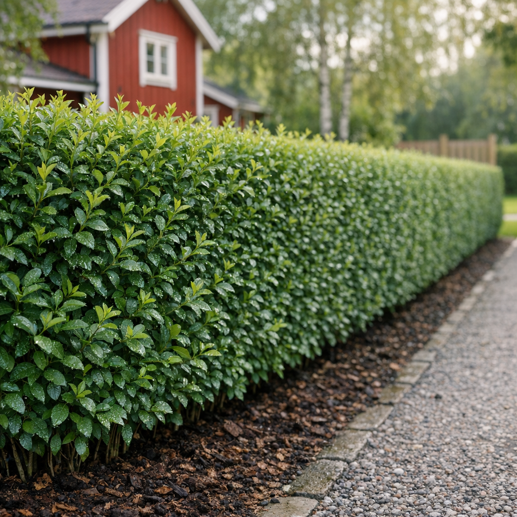 11 september 2025 4 min 3505 Senast uppdaterad 6 februari 2026 by Therese Hermansson Innehållsförteckning Rätt läge och jord för en stark ligusterhäckBevattning och näring: etablera först, optimera senBeskärning för tät och jämn häckVintervård och skyddVanliga frågor om skötsel av ligusterhäckVad ska man gödsla ligusterhäck med?Hur får man en tät liguster?När ska man klippa ligusterhäck första gången?Varför tappar min liguster blad? Rätt läge och jord för en stark ligusterhäck Liguster trivs i sol till halvskugga. För en riktigt tät häck är 4–6 timmars ljus per dag lagom. Jorden bör vara mullrik och väldränerad med ett pH kring 6–7. Förbättra tung lerjord med kompost och grov sand, och blanda in kompost i lätt jord för att hålla fukt. Undvik stående vatten och placera inte häcken där vägsalt stänker in utan skydd. Gör ett dräneringstest: fyll planteringsspåret med vatten och se att det sjunker undan inom ett dygn. Sikta på minst 40 cm bra jorddjup och luckra botten innan plantering. Vindutsatt läge? Planera för vindskydd de första säsongerna. Bevattning och näring: etablera först, optimera sen Nyplanterad häck måste hållas jämnt fuktig. Vattna igenom direkt efter plantering. Första säsongen vattnar du 2–3 gånger per vecka vid torka, cirka 10–15 liter per meter häck. Lägg 5 cm täckbark som fukt- och ogrässkydd. Andra säsongen vattnar du mer sällan men rejält – bara vid torrperioder. Etablerade häckar klarar sig oftast själva och behöver vatten först vid långvarig torka. Läs mer om vattna din ligusterhäck. Gödsel ger tätare tillväxt. Använd organisk, långsamverkande trädgårds- eller häckgödsel tidig vår och eventuellt en lätt komplettering i juni. Undvik kväverik gödsling efter juli så att skotten hinner avmogna inför vintern. Kompost fungerar utmärkt som jordförbättring och mild näring. Titta på plantornas signaler: blekgrönt bladverk och svag skottillväxt tyder ofta på näringsbrist eller uttorkning. Se vår guide till gödsel för häckar. Beskärning för tät och jämn häck Nyckeln till en tät ligusterhäck är regelbunden klippning. Håll basen bredare än toppen så att ljuset når hela växten. Klipp hellre lite och ofta än sällan och hårt. Använd vassa verktyg och sikta på 1–2 formklippningar per säsong, normalt i juni och igen i augusti om tillväxten varit stark. Få fler tips i klippning för tät snabbväxande häck. Uppbyggnad de första 2–3 åren: toppa lätt när plantan kommit igång för att stimulera sidoskott. Höj häcken successivt genom att klippa toppen sparsamt och låta sidorna förgrena sig. Äldre, glesa häckar kan föryngringsklippas tidig vår – klipp ner till 20–40 cm och låt skjuta nya skott. Är häcken lång kan du dela ingreppet över två år. Klipp inte i stark sol eller vid frost. Använd snöre eller rätskiva för en rak linje. Samla upp klipp så minskar risken för bladfläck på fuktig sommar. Vintervård och skydd Ge en rejäl rotblöta på hösten innan tjälen går i marken. Lägg 5–10 cm täckbark över rotzonen för att jämna ut fukt och temperatur. I utsatta lägen kan du sätta skuggväv mot vårvintersol och vind under de första säsongerna. Bind upp unga plantor där snölaster är tunga och skaka av blötsnö vid behov. Nära saltade vägar – använd skyddsduk eller avskärmning. För helårsöversikt och checklista, se våra skötselråd för häckar. Vanliga frågor om skötsel av ligusterhäck Vad ska man gödsla ligusterhäck med? Välj organisk, långsamverkande häck- eller trädgårdsgödsel. Lägg huvudgivan tidig vår och en lätt komplettering i juni. Kompost och gräsklipp som ytgödsling fungerar också bra. Vattna in gödseln. Hur får man en tät liguster? Ge rätt ljus, klipp regelbundet med basen bredare än toppen, toppa lätt tidigt för att stimulera sidoskott, håll jämn fukt första säsongerna och ge en balanserad vårgiva gödsel. Läs mer i hur får man häcken tät snabbt. När ska man klippa ligusterhäck första gången? Första sommaren när plantan kommit igång. Toppklipp lätt några centimeter för att stimulera förgrening. Gör formklippning i juni och eventuellt i augusti beroende på tillväxt. Varför tappar min liguster blad? Vanliga orsaker är torka, övervattning, vårvintersol, saltstänk, flyttstress eller svampsjukdom. Kontrollera jordfukt, skydda med skuggväv i utsatta lägen, klipp försiktigt och gödsla på våren. Välj rätt sort för din plats – hos Plantinavia hittar du vintergrön liguster i flera höjder och kvaliteter, som rotklump eller kruka, med snabb och trygg leverans.