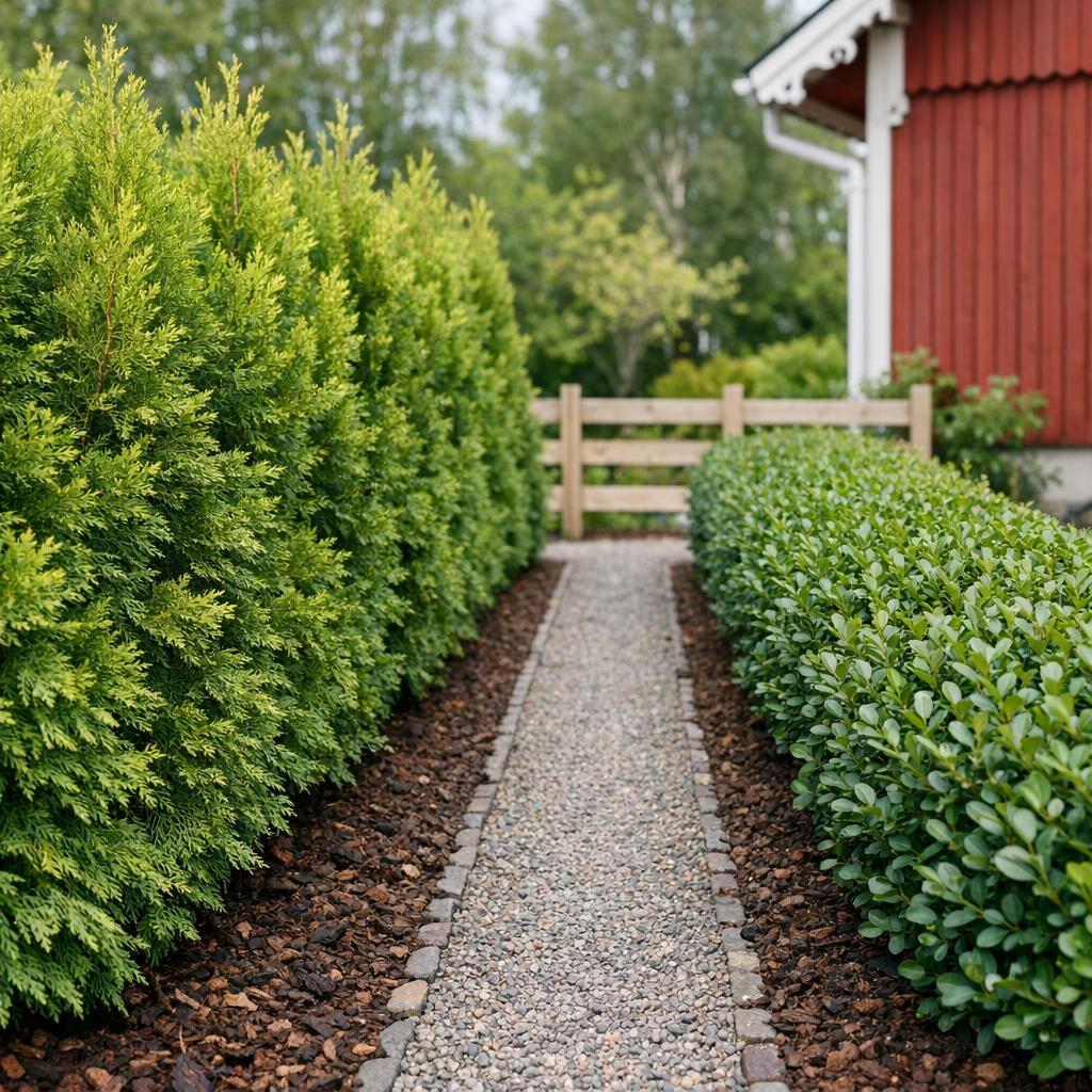 9 december 2025 4 min 3008 Senast uppdaterad 27 februari 2026 by Therese Hermansson Innehållsförteckning Tillväxthastighet i siffror: tuja och ligusterVad avgör hur snabbt din häck växer?När ska du välja tuja respektive liguster?Praktiska tips för en snabb startVanliga frågorVilken häckväxt växer snabbast?Hur snabbt växer en liguster?Hur snabbt växer tujor?Vilken barrväxt växer snabbast? Tillväxthastighet i siffror: tuja och liguster Hos Plantinavia anges att Thuja Brabant växer cirka 30-50 cm per år under goda förhållanden. Det är en av de snabbaste barrväxterna för häck i svenska trädgårdar och den håller en tät, vintergrön vägg året runt. Andra tujasorter kan vara något långsammare, men det finns snabba alternativ, till exempel Thuja ’King of Brabant’. Liguster etablerar sig ofta lugnare. Första säsongen kan du räkna med omkring 20 cm, följt av 30-50 cm per år när plantan väl rotat in sig. Exempelvis Liguster ’Liga’ är känd för god tillväxt. Den takten förutsätter näringsrik, väldränerad jord, jämn fukt och regelbunden klippning. Slutsats i ren hastighet: tuja är oftast snabbast direkt, medan en välskött liguster kan matcha farten från och med år två. Vad avgör hur snabbt din häck växer? Planteringsläge och zon spelar stor roll. Värme, ljus och vindskydd gynnar tillväxt, men både tuja och liguster behöver skydd mot stående väta och extrem torka. I halvskugga trivs liguster bra, medan tuja gärna har jämn ljusnivå och fuktig men dränerad jord. Jord och näring är avgörande. Förbättra planteringsjorden med mull och se till jämn markfukt. En långsamverkande gödsel på våren ger jämn fart. Tillskott tidigt på sommaren kan påskynda säsongens skott utan att stressa plantan sent på året. Beskärning styr täthet och energi. Klipp sidorna lätt under sommaren för att stimulera förgrening. Toppa först när önskad höjd är nådd, annars sinkar du höjdtillväxten. Unga plantor svarar starkt på regelbunden, men måttlig, formklippning. När ska du välja tuja respektive liguster? Välj tuja om du vill ha vintergrönt insynsskydd så snabbt som möjligt, med en konsekvent tät vägg året runt. Thuja Brabant växer snabbt, är lätt att forma och ger ett enhetligt uttryck. Den trivs bäst i jämnt fuktig, väldränerad jord och ogillar långvarig torka. Välj liguster om du vill ha en tålig, flexibel och naturlig häck som klarar varierande jordar och även halvskugga. Den blir snabbt tät efter etablering, blommar diskret och ger bär som gynnar trädgårdens djurliv. I mildare lägen är vintergrön liguster ofta vintergrön eller halvt städsegrön, men i kallare lägen kan den tappa mer blad vintertid. Praktiska tips för en snabb start Välj rätt plantstorlek för målet. Lite större plantor ger snabbare visuell effekt, men glöm inte att rötterna behöver kontakt med förbättrad jord i hela planteringsdiket. Planteringsavstånd påverkar hur fort häcken sluter sig. För Thuja Brabant är 2-3 plantor per meter vanligt beroende på storlek vid köp. För liguster är 3-5 plantor per meter normalt, då den byggs upp som en tät lövhäck. Vattna rikligt första säsongen så att jorden hålls jämnt fuktig utan att bli blöt. Lägg gärna ett lager jordförbättrande material som hjälper fukthållningen. Gödsla på våren och undvik sen kvävegödsling som driver mjuka skott inför vintern. Klipp försiktigt sidorna under sommaren och vänta med toppning tills höjden är uppnådd. Läs mer i vår guide: Så väljer du snabbväxande häck. Vanliga frågor Vilken häckväxt växer snabbast? I svenska trädgårdar är Thuja Brabant ett av de snabbaste säkra valen, ofta 30-50 cm per år. En väl etablerad liguster kan därefter matcha den takten. Störst skillnad ser du första året, då liguster vanligen går långsammare innan rötterna byggts upp. Här hittar du fler snabbväxande häckväxter. Hur snabbt växer en liguster? Räkna med cirka 20 cm första säsongen, därefter omkring 30-50 cm per år vid god skötsel. Bäst fart får du med mullrik, väldränerad jord, jämn fukt och regelbunden klippning som stimulerar förgrening och täthet. Hur snabbt växer tujor? Thuja Brabant växer normalt cirka 30-50 cm per år i gynnsamma lägen. Vissa sorter är långsammare. Håll jämn markfukt, gödsla på våren och formklipp sidorna sommartid för att behålla farten och tätheten. Vilken barrväxt växer snabbast? För häck i Sverige är Thuja Brabant bland de snabbaste barrväxterna med pålitlig härdighet. I mildare lägen kan vissa cypresser växa ännu snabbare, men tuja är oftast det tryggare valet i större delen av landet.