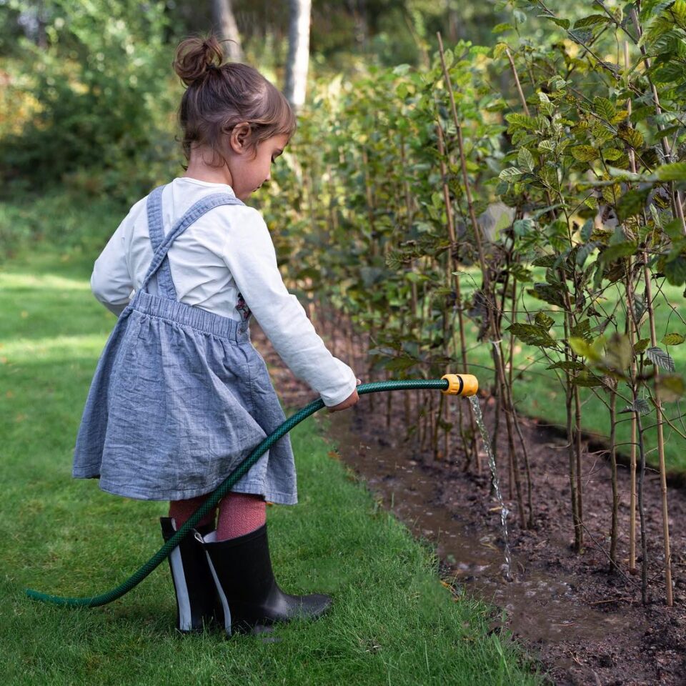 Vi har vattnat regelbundet med droppslang eftersom det har varit torrt och varmt under vår och försommar. Nu efter två månader har häcken redan slagit skott, tätnat och vuxit drygt 15 cm.