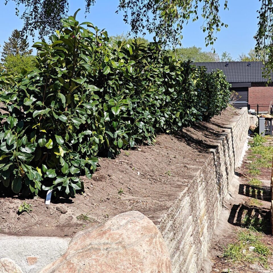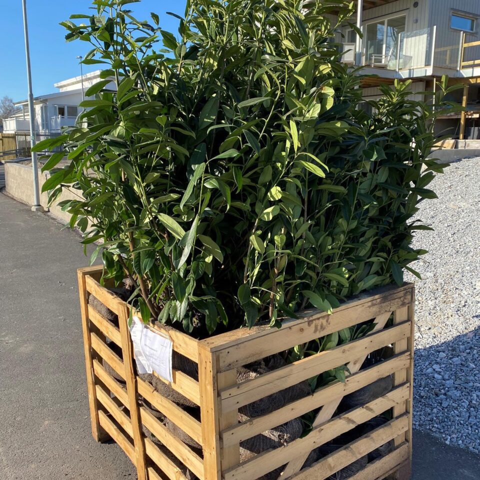 Vi håller på att bygga pool, har tagit ner en stor risig blandhäck och behövde snabbväxande insynsskydd som inte fäller för mycket löv i vattnet. Det blev en lagerhägg Prunus laurocerasus Genolia, som ger insynsskydd även på vintern. Vi valde 100 cm grenad, men fick uppdaterat till väl grenad. Färre plantor, men till lika lång sträcka. Häcken finns på plats sedan den 13/4 och vi är sååå nöjda.